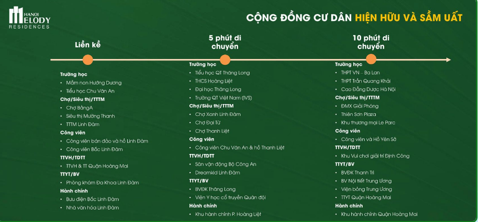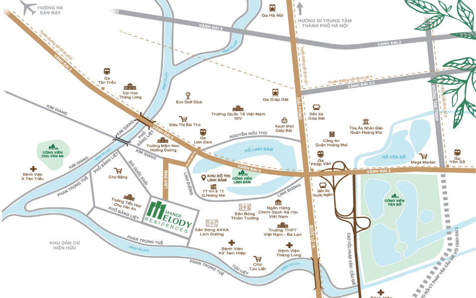 • Ngoài vị thế tốt, Hà Nội Melody Residences còn thuận tiện kết nối vớic các nút giao thông thương mại, kết nối liên vùng của khu vực như trục đường Giải Phóng – Trường Trinh – Đại La, Giải Phóng – Xã Đàn – Đại Cồ Việt, các cao tốc Pháp Vân – Cầu Giẽ, đường Vành Đai 3, Vành Đai 5,…